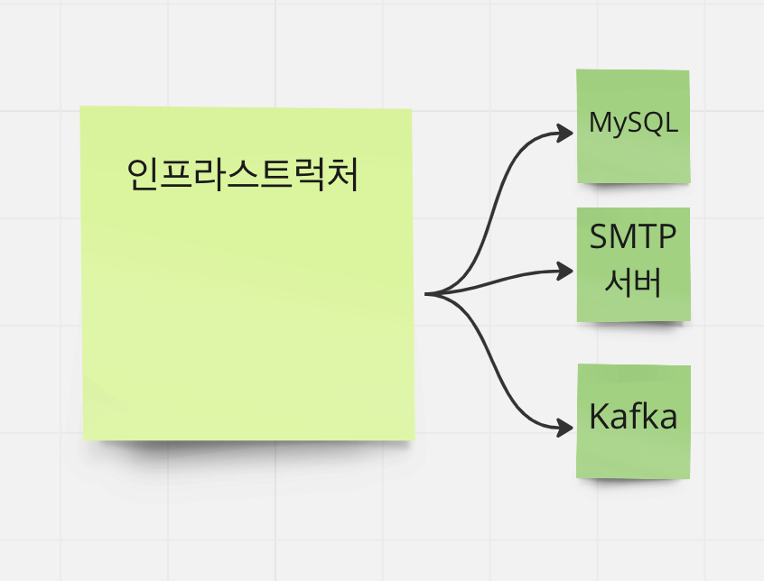 인프라스트럭처 영역은 구현 기술에 대한 부분입니다. 이 영역에서 RDBMS와 같은 DB들과 연동을 하거나 메시징 큐를 사용한다면 큐에 메시지를 전송/수신 하는 기능을 구현하고 몽고 DB 등을 사용해서 테이터베이스와의 연동을 처리합니다. 이 영역에서 SMTP 를 활용하여 메일 발송이 이루어지거나 HTTP 클라이언트를 통해 REST API 를 호출에 관한 처리가 이루어지기도 합니다.