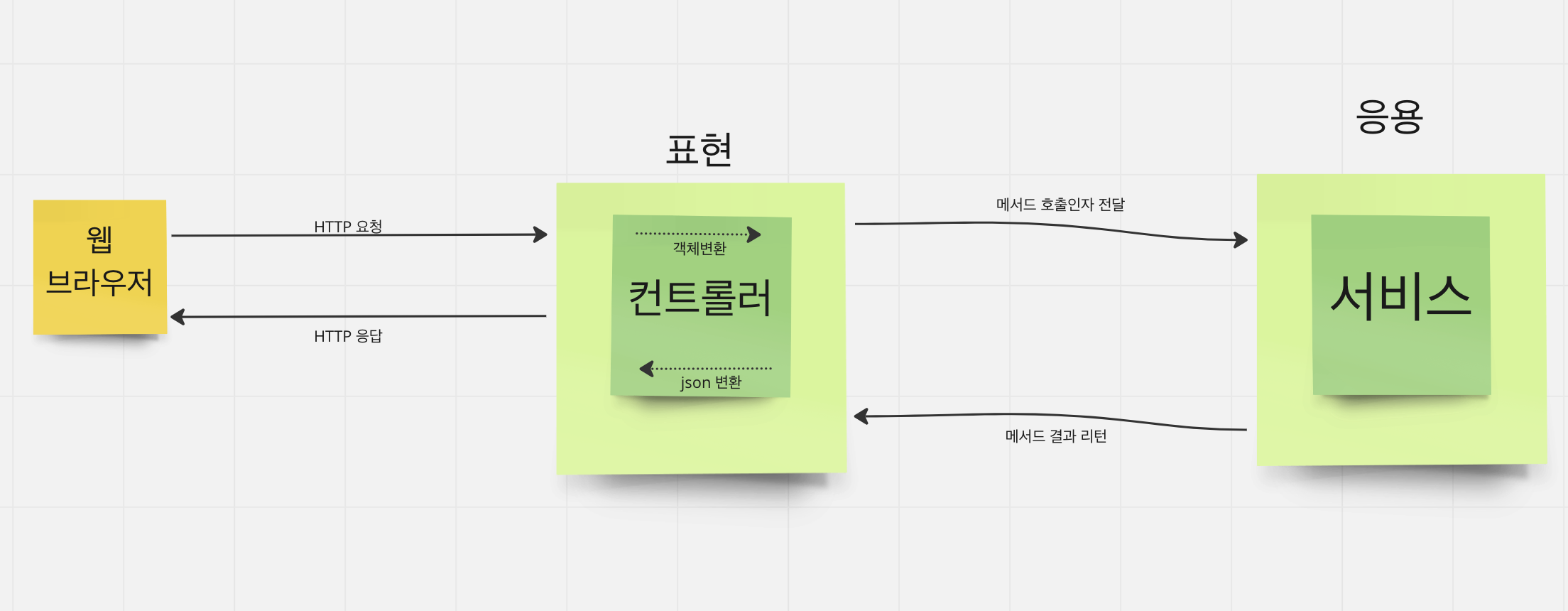 위의 이미지에서 볼 수 있듯 웹 애플리케이션에서 '표현영역'은 HTTP 요청을 받아 '응용영역'이 필요로 하는 형식으로 객체 변환하여 전달하고 응용 영역의 응답을 HTTP 응답으로 변환(일반적으로 json 형식)하여 전송합니다.